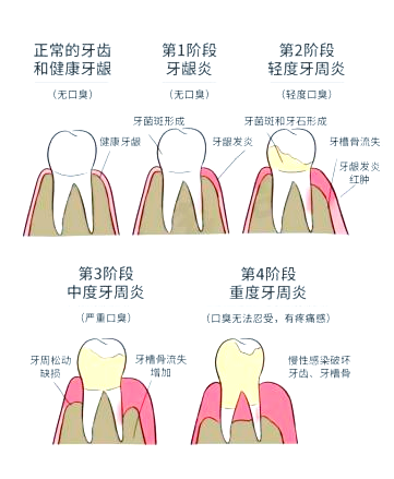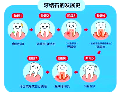 牙结石通常附着在唾液腺开口处的牙齿表面,最初呈现为乳白色的软垢,随着时间的推移,这些软垢会逐渐钙化,颜色变深,质地变硬。牙结石是牙周病发展的关键致病因素,它会持续刺激牙周组织,压迫牙龈,阻碍血液循环,导致牙周组织受到病菌感染,进而引发牙龈发炎、萎缩,最终形成牙周囊袋。
